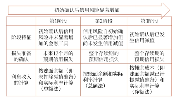 一般情況下,企業(yè)應(yīng)當(dāng)在每個資產(chǎn)負(fù)債表日評估相關(guān)金融工具的信用風(fēng)險(xiǎn)自初始確認(rèn)后是否已顯著增加,可以將金融工具發(fā)生信用減值的過程分為三個階段,并按照下列情形分別計(jì)量其損失準(zhǔn)備、確認(rèn)預(yù)期信用損失及其變動。