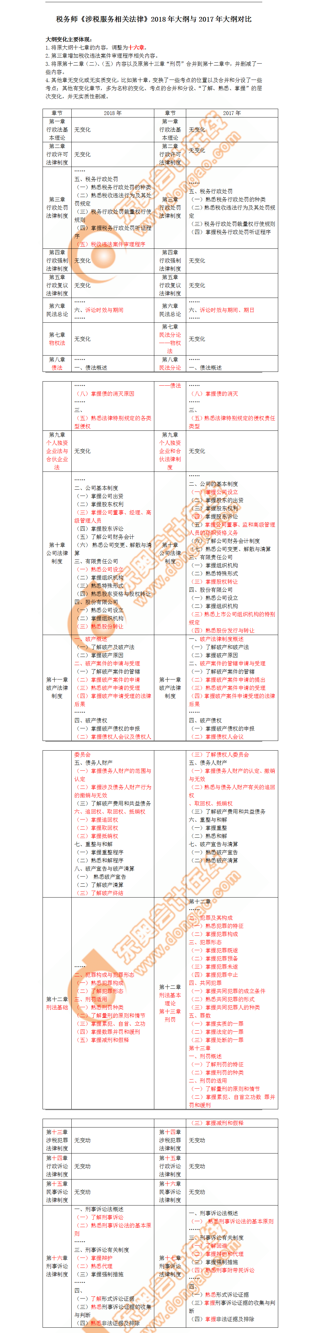 相對(duì)來說,《涉稅服務(wù)相關(guān)法律》需要記憶的東西比較多,因此,考生們更要好好把握考試大綱的精髓,將變化的地方重點(diǎn)記憶。更多學(xué)科考試大綱變化對(duì)比分析,請(qǐng)參考2018稅務(wù)師新舊考試大綱變化分析匯總。