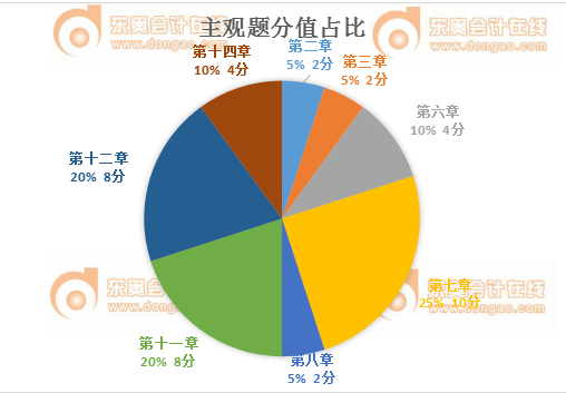 在了解完主觀題章節(jié)分布之后,我們一起來看一下各章節(jié)的分值占比。根據下圖我們可以得知:第七章的分值占主觀題的25%,也就是四分之一;第十一章、十二章分值各占20%;第六章、十四章分值各占10%;剩余章節(jié)均為5%。由此可見,第七章、第十一章、第十二章比較受到命題人的青睞,大家在備考時要多加學習。