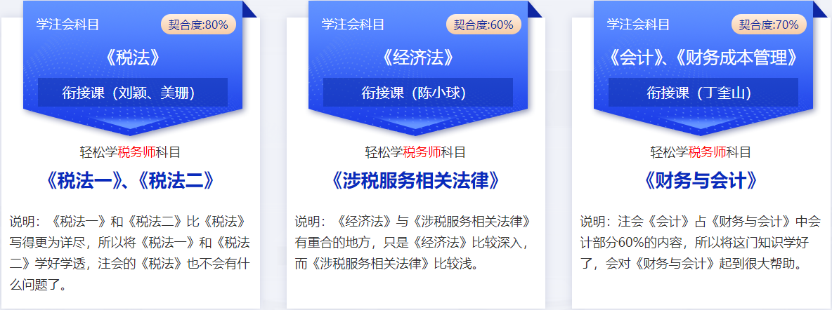 注會的《經(jīng)濟法》和稅務(wù)師的《涉稅服務(wù)相關(guān)法律》間的契合度高達(dá)60%;