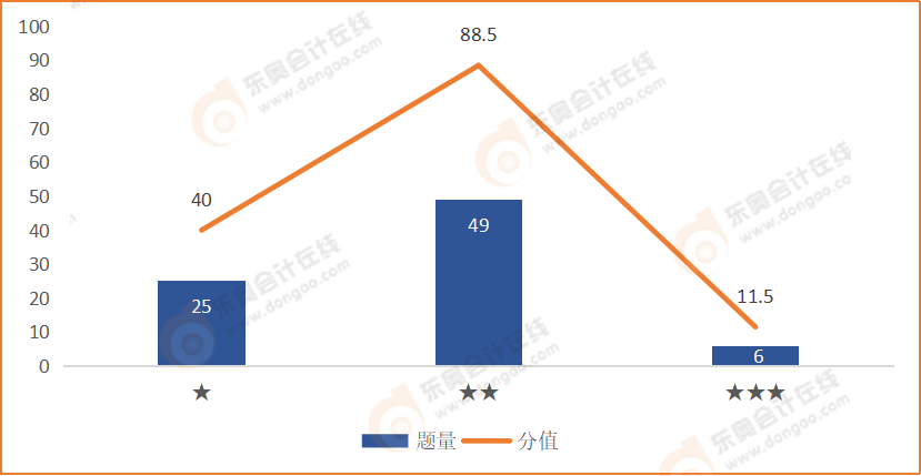 如上圖數(shù)據(jù)表所示,2021年稅務(wù)師延考稅法一科目對考生們的考查,以二星考題為主。本次考試二星難度考題共有49道,其分值占總體分值的一半以上,達到了88.5分。一星難度考題共有25道,所占分值為40分,三星難度的考題所占分值比例最少,為11.5分,考試題量也僅有6道。