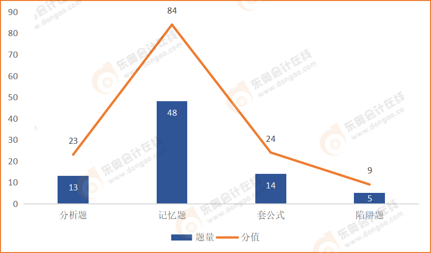 從上述數(shù)據(jù)表可以看出,本次考試以記憶型考題為主,共考查了48道,分值為84分。對分析型考題和套公式型考題的考查相對較少,其中套公式型考題共考查了14道,總分值為24分。分析型考題為13道,所占分值為23分。陷阱型考題數(shù)量最少,僅為5道,考查分值為9分。