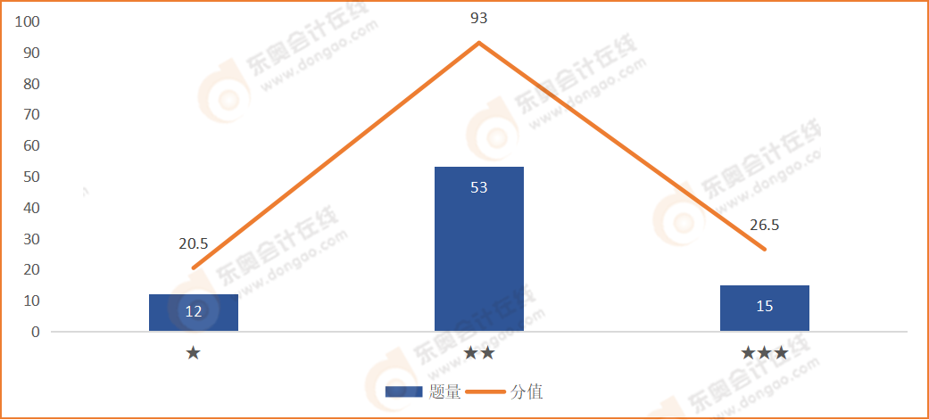 在本次財務(wù)與會計科目的考試中,二星難度的考題占總考題數(shù)量的一半以上,其題量高達53道,總分值超過93分!其次是一星難度考題和三星難度考題,兩者題量相差不大,分別為12道和15道。但是相比一星難度考題,三星難度考題所占分值更多,為26.5分,一星難度考題僅占20.5分。