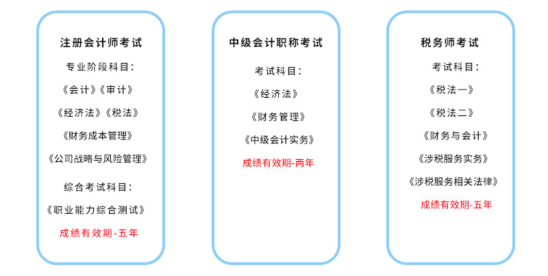 中級(jí)會(huì)計(jì)職稱考試科目有三科,考試成績(jī)有效期為兩年,考生須在連續(xù)兩個(gè)考試年度內(nèi)取得全科目成績(jī)合格。