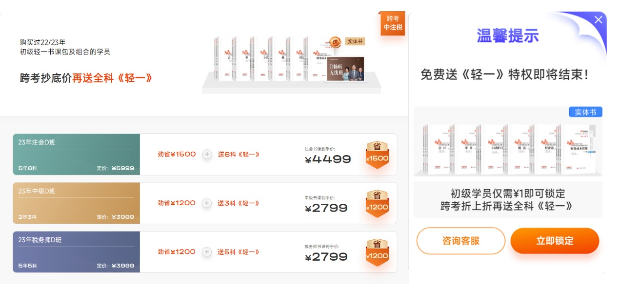 如果你是初級學(xué)員,想要跨考中、注、稅考試,那么趕緊參與1元跨考活動(dòng),活動(dòng)中免費(fèi)贈送《輕一》實(shí)體書的特權(quán)已經(jīng)進(jìn)入倒計(jì)時(shí),從未有過的免費(fèi)獲贈整套《輕一》實(shí)體書的先例,機(jī)會難得,想要報(bào)考的同學(xué),千萬不要錯(cuò)過。