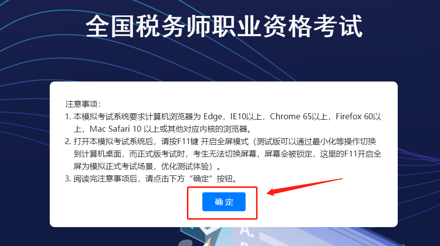 請各位稅務(wù)師考生仔細(xì)閱讀“注意事項(xiàng)”,然后點(diǎn)擊“確定”。
