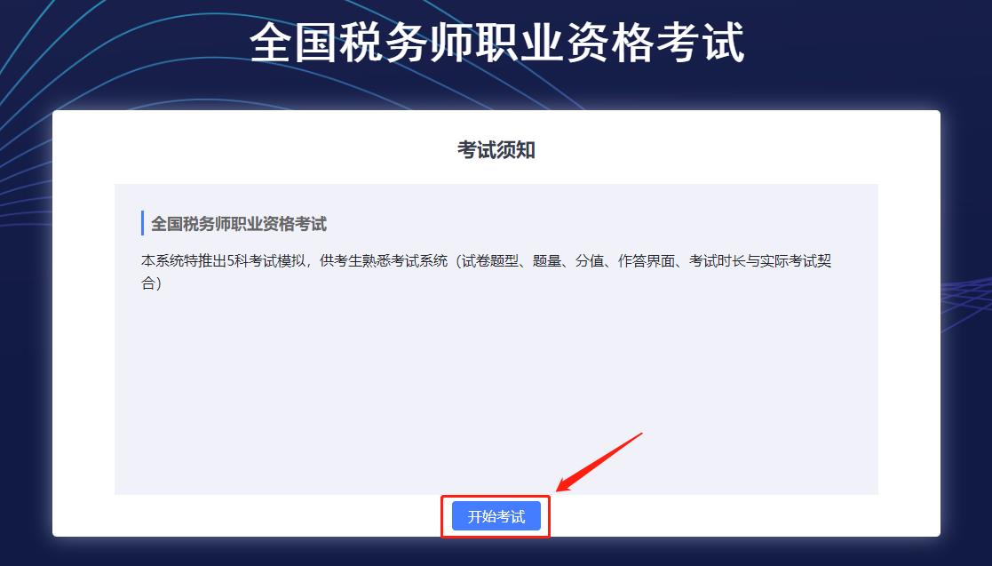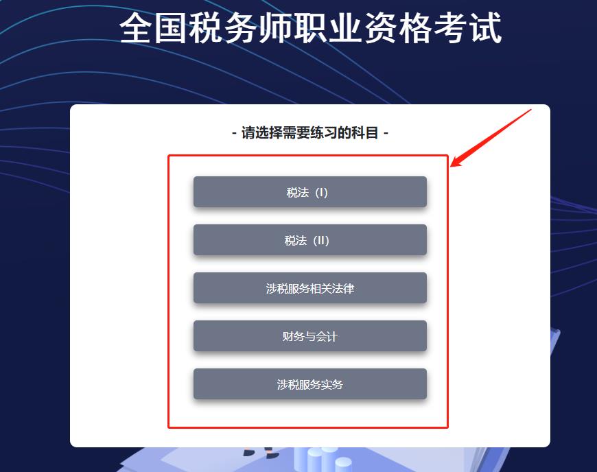 選擇需要練習(xí)的稅務(wù)師考試科目。(注:由于此系統(tǒng)為稅務(wù)師機(jī)考模擬系統(tǒng),因此到正式考試時(shí),各位考生需要根據(jù)自己報(bào)考的稅務(wù)師科目,謹(jǐn)慎選擇。)