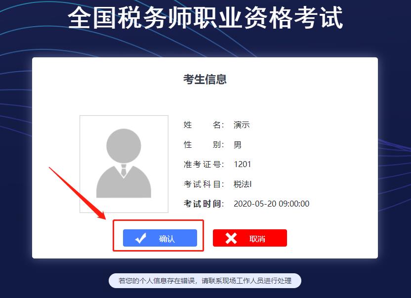 確認(rèn)考生信息,若考生個(gè)人信息無誤,則可以點(diǎn)擊“確認(rèn)”,進(jìn)入下一步。(注:下文所示為機(jī)考模擬系統(tǒng)測試信息,請各位考生以自己實(shí)際個(gè)人信息為準(zhǔn),下方信息為模擬信息,僅供參考。)