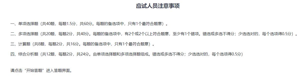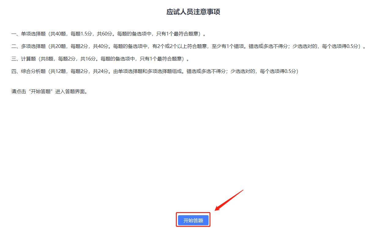 進(jìn)入答題頁面后,考生須仔細(xì)閱讀“應(yīng)試人員注意事項(xiàng)”,然后點(diǎn)擊“開始答題”。