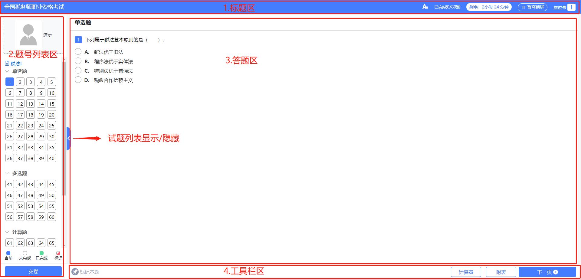 左側(cè)試題列表區(qū)從上到下依次為考生信息演示、試題列表顯示/隱藏、交卷。