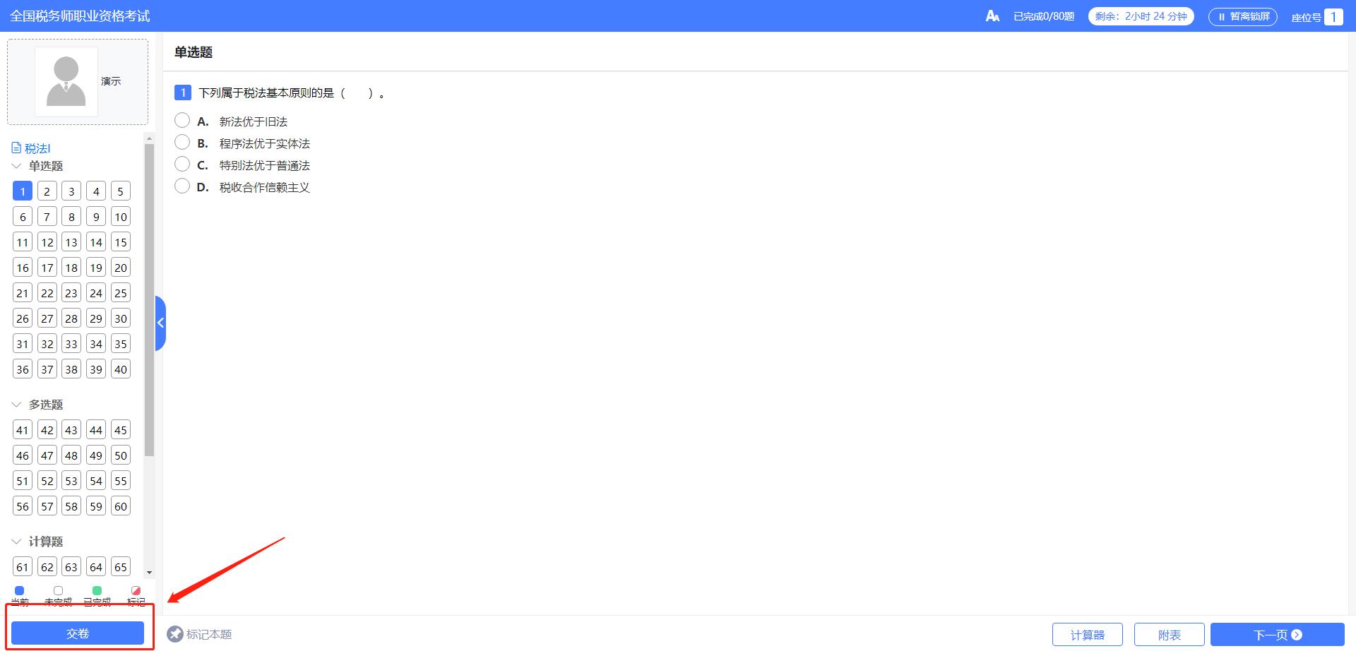 底部工具欄區(qū)從左到右依次為標(biāo)記本題、計(jì)算器、附表以及翻頁。