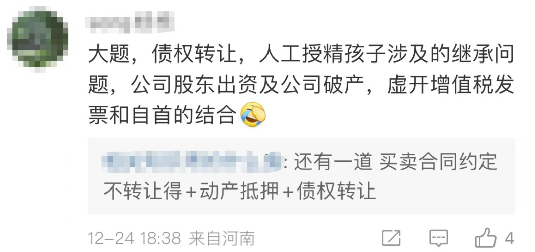 根據(jù)考生們的反饋,2022稅務(wù)師延考《涉稅服務(wù)相關(guān)法律》科目大概涉及到保證合同、債權(quán)轉(zhuǎn)讓、繼承法、公司股東出資及公司破產(chǎn)、虛開增值稅發(fā)票和自首的結(jié)合等知識點。