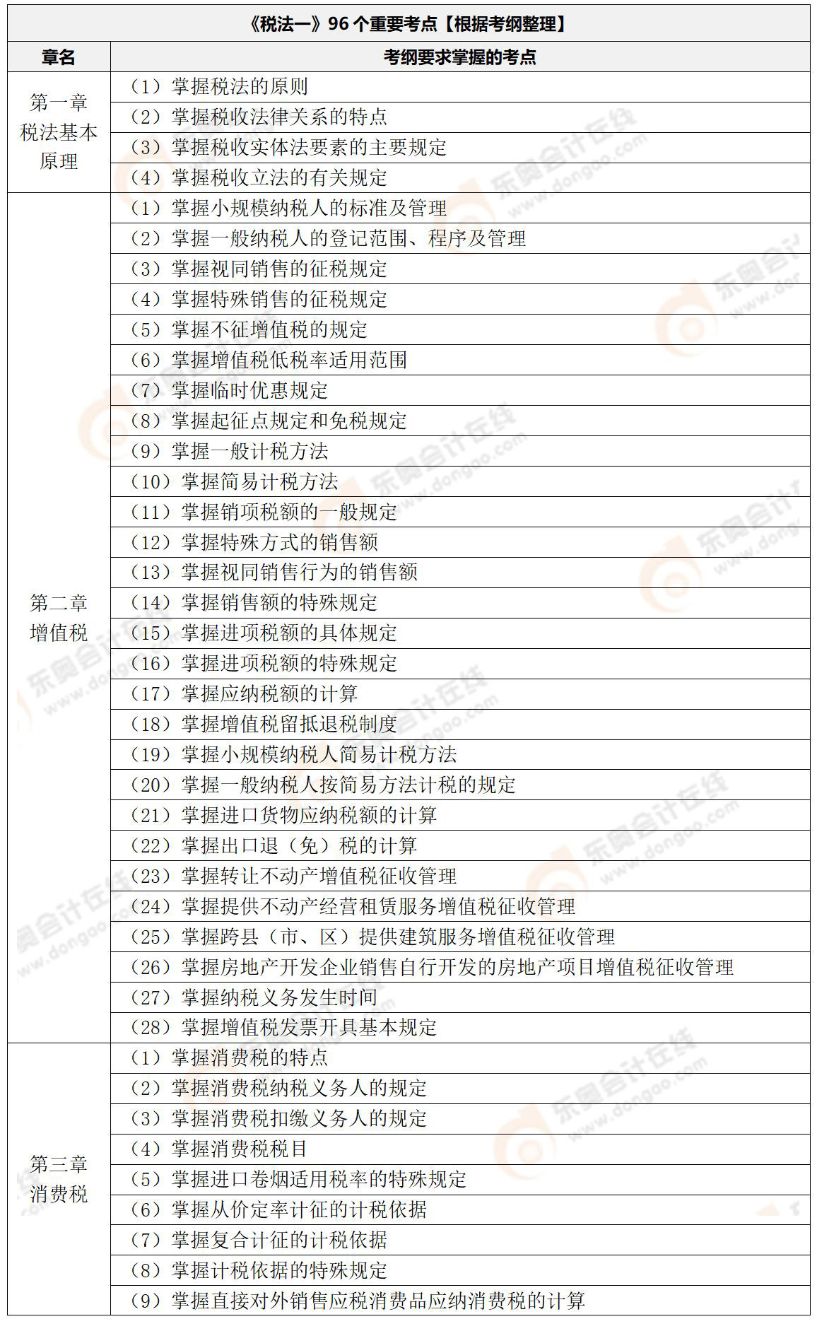 2024年稅務(wù)師考試時間暫未確定,在稅務(wù)師備考預(yù)習(xí)階段,考生可先通過了解各科目考點框架,對各科目難易程度及考查的內(nèi)容有大致了解,東奧會計在線根據(jù)考試大綱為大家整理了《稅法一》科目的96個重要考點,一起看下。