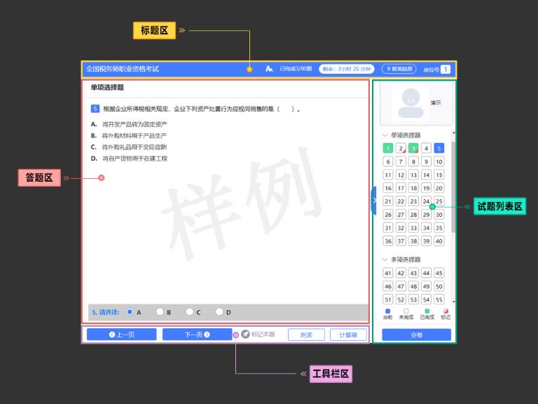 試題的狀態(tài)用不同的圖標樣式進行區(qū)分,包括當前試題、未完成試題、已完成試題、部分完成試題和標記的試題。