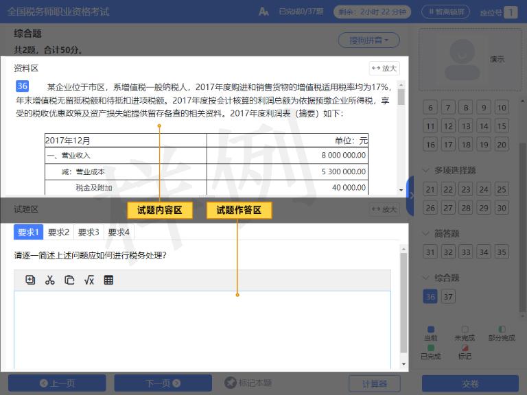 3)主觀題的資料區(qū)以及試題區(qū)的工具欄使用方法可以參考答題輔助功能使用說明。此外,為方便考生作答,答題時使用鍵盤直接輸入數(shù)字或符號,以及使用快捷鍵功能,系統(tǒng)都可接受,作答結(jié)果不受影響。
