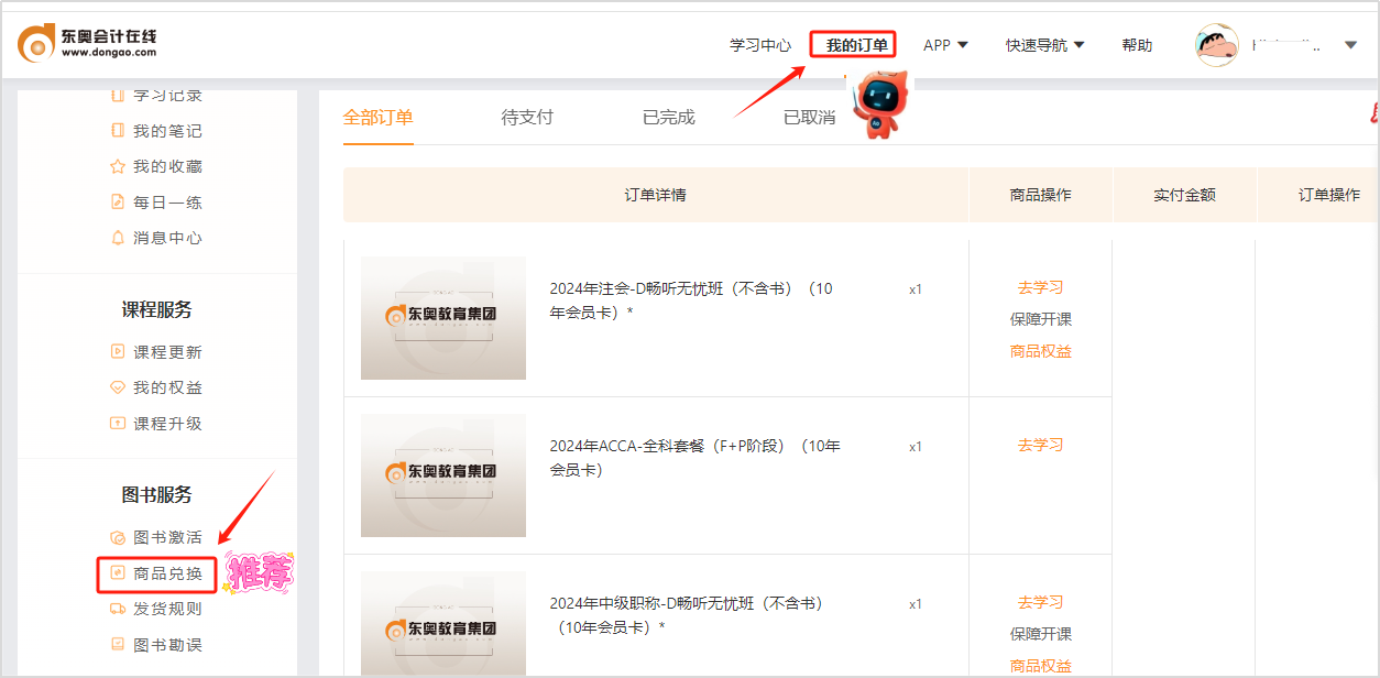 登錄ww.dongao.com→我的訂單→左側導航欄【圖書服務】中“商品兌換”→選擇圖書→兌換: