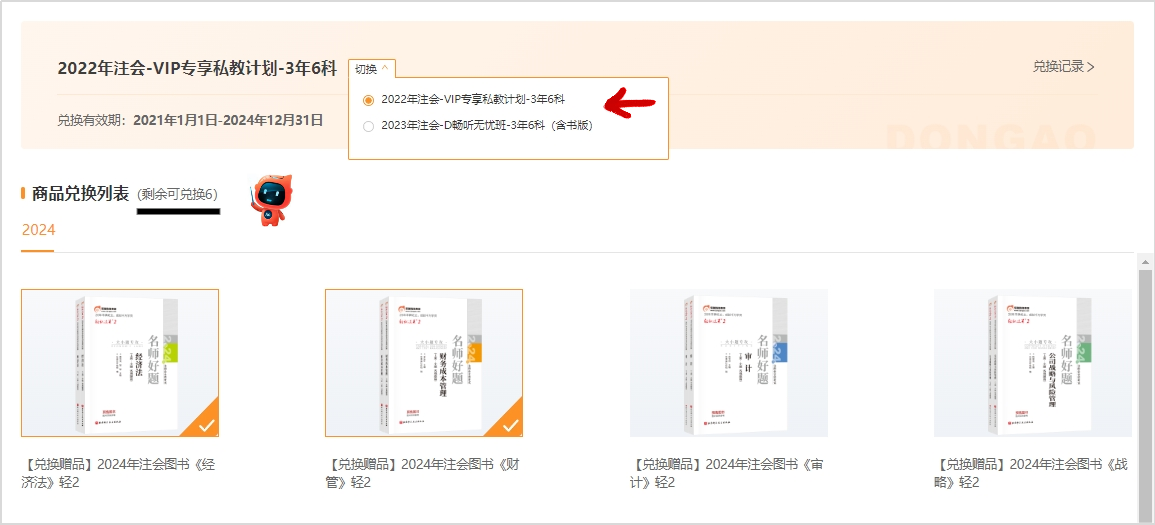 如有多個含書商品,可以點擊切換選擇,同時請您注意各商品的兌換次數(shù),直接點擊您需要兌換的圖書,頁面最底端,點擊“兌換”按鈕即可: