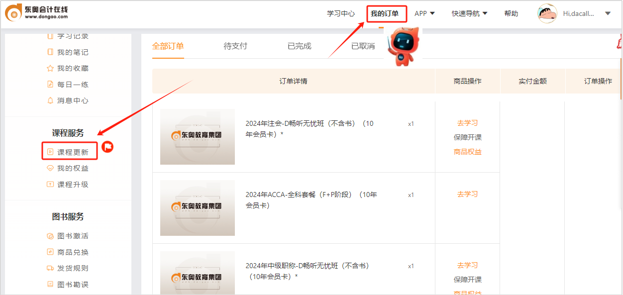 登錄ww.dongao.com→我的訂單→左側導航欄【課程服務】中“課程更新”→選擇科目→全部課程/我聽過的課程,即可查看課程上傳進度: