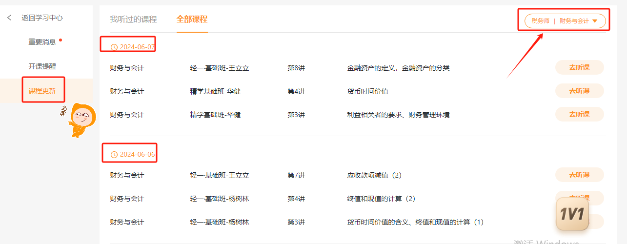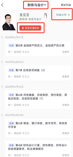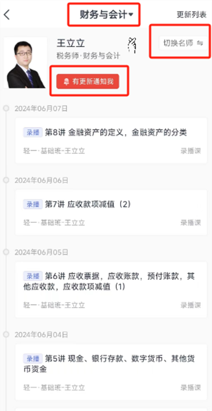 登錄【會計云課堂】APP→右下角“我的”→【我的權益】中“課程更新”,可以選擇科目、老師查看對應進度,并且可以訂閱更新通知: