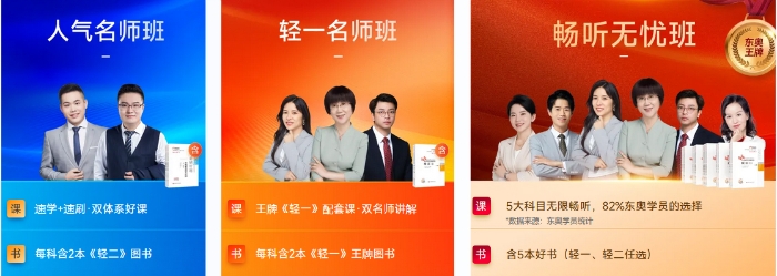 輕一名師班:單科首選,每一科都有兩位東奧名師授課,輕一作者+人氣名師,共計14位名師授課,搭配的《輕一》圖書,是一套高效、精煉課程。