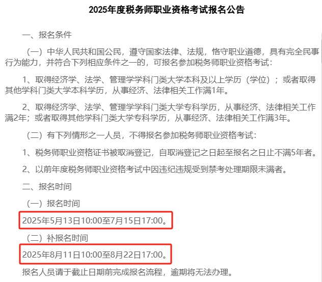 根據(jù)中國(guó)注冊(cè)稅務(wù)師協(xié)會(huì)所公布的2025年度稅務(wù)師職業(yè)資格考試報(bào)名公告》,可得知2025年稅務(wù)師報(bào)名的截止時(shí)間為71517:00。