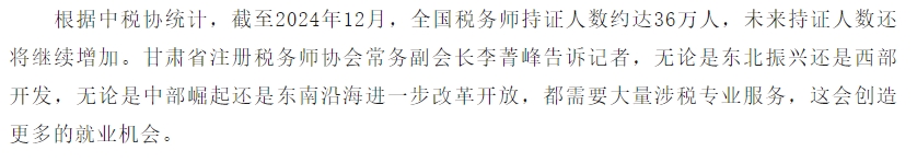 根據(jù)《中國稅務(wù)報(bào)》發(fā)布的《中國稅務(wù)報(bào):考取稅務(wù)師職業(yè)資格 給未來職業(yè)發(fā)展增加更多可能性》,其內(nèi)容顯示,2025年稅務(wù)師考試報(bào)名人數(shù)共72.47萬人,報(bào)考科次達(dá)177.63萬,報(bào)考科次首次超過了長期占據(jù)財(cái)會(huì)考試“金字塔尖”的注冊(cè)會(huì)計(jì)師考試。并且根據(jù)中稅協(xié)統(tǒng)計(jì),截至2024年12月,全國稅務(wù)師持證人數(shù)約達(dá)36萬人,未來持證人數(shù)還將繼續(xù)增加。