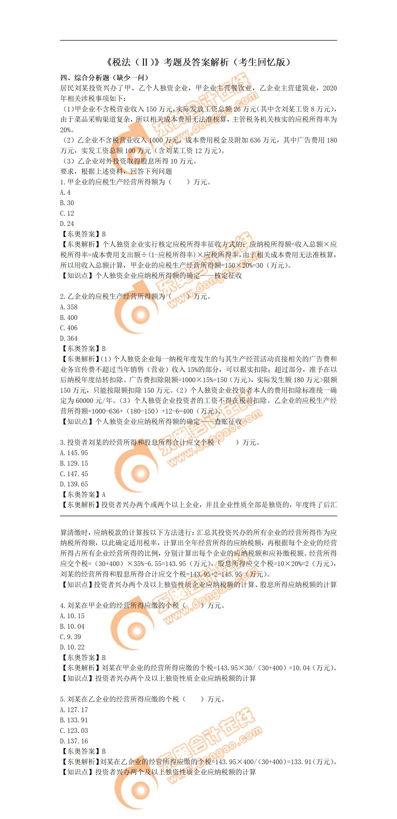 注:以上稅務(wù)師考試試題內(nèi)容由考生回憶反饋,東奧教研團(tuán)隊統(tǒng)計,東奧會計在線整理發(fā)布