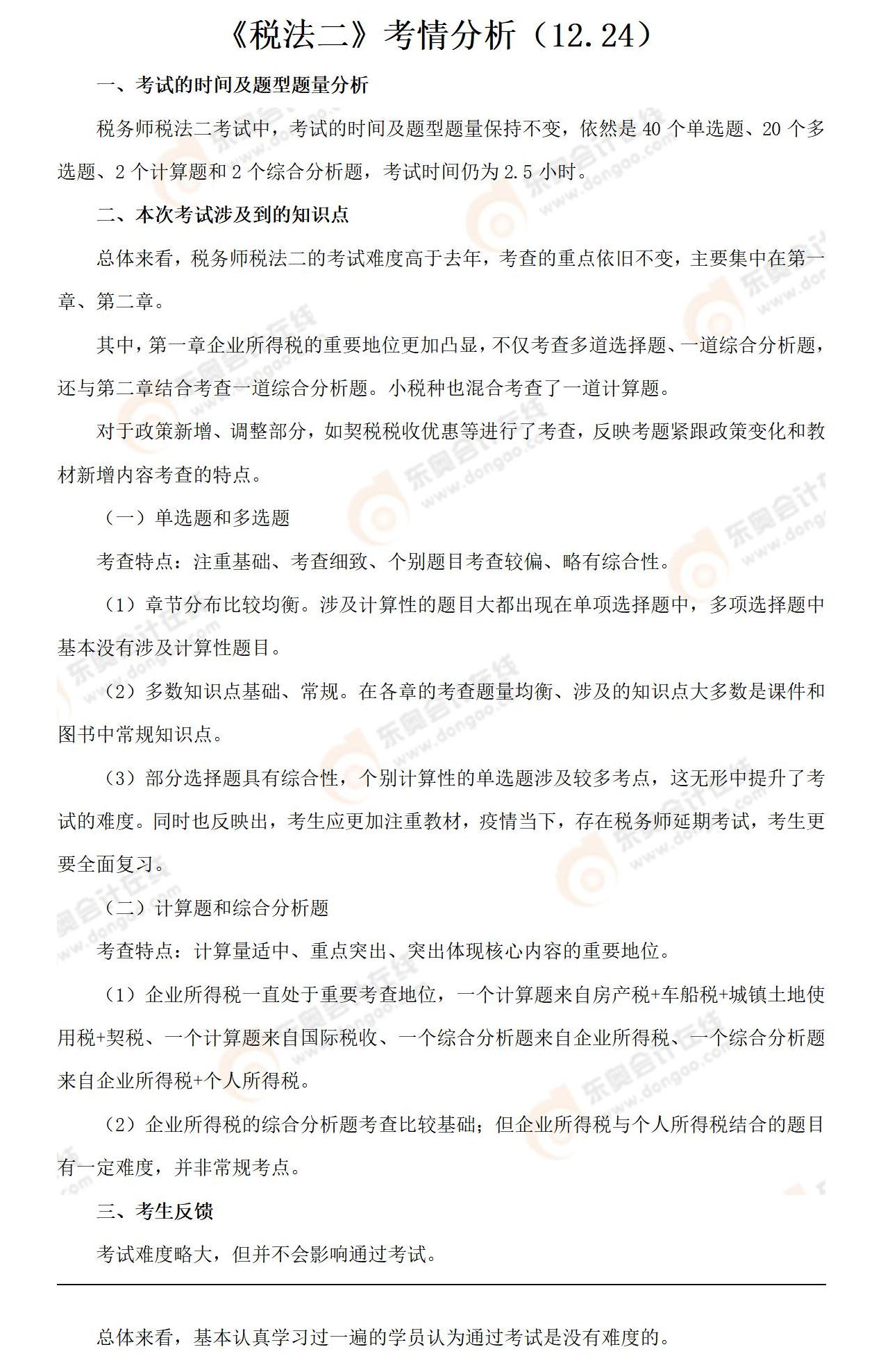 2022年稅務師延考《稅法二》考試圓滿結(jié)束,大家有發(fā)揮出自己的正常水平嗎?為了幫大家提前了解自己的考試情況,東奧會計在線為大家整理了本場考試的考情和考點,一起看看吧!>>>查看延考全科目考情考點<<<