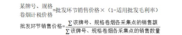 2.計(jì)稅價(jià)格由國(guó)家稅務(wù)總局按照卷煙批發(fā)環(huán)節(jié)銷(xiāo)售價(jià)格扣除卷煙批發(fā)環(huán)節(jié)批發(fā)毛利核定并發(fā)布。計(jì)稅價(jià)格的核定公式為: