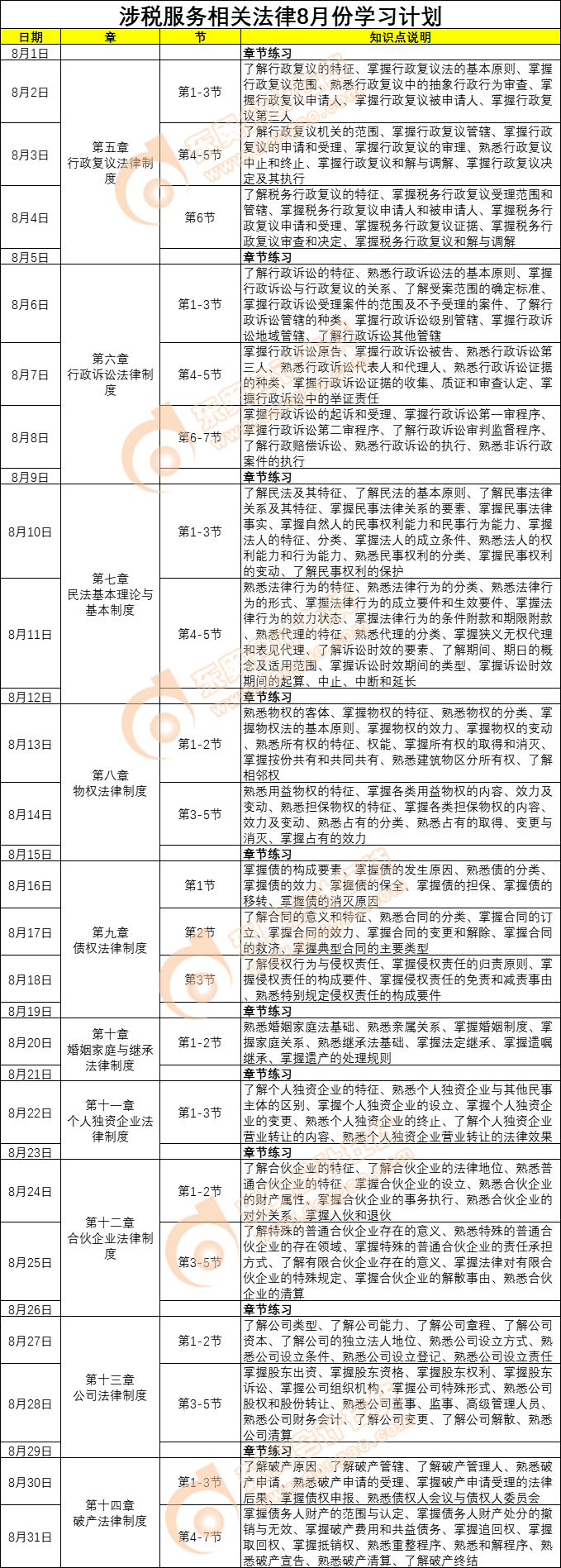 分享!2021年稅務(wù)師《涉稅服務(wù)相關(guān)法律》8月份每日學(xué)習(xí)計劃!