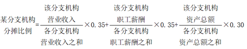 總機構(gòu)應(yīng)按照上一年度分支機構(gòu)的營業(yè)收入、職工薪酬和資產(chǎn)總額三個因素計算各分支機構(gòu)應(yīng)分攤所得稅款的比例;三級及以下分支機構(gòu),其營業(yè)收入、職工薪酬和資產(chǎn)總額統(tǒng)一計入二級分支機構(gòu);三個因素的權(quán)重依次為0.35、0.35、0.30,計算公式如下: