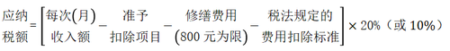 由納稅人負擔(dān)的該出租財產(chǎn)實際開支的修繕費用 | ①需提供有效、準(zhǔn)確憑證 ②允許扣除的修繕費用,以每次800元為限,一次扣除不完的,準(zhǔn)予在下一次繼續(xù)扣除,直到扣完為止 |