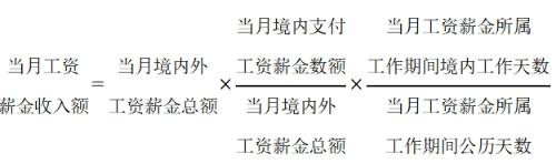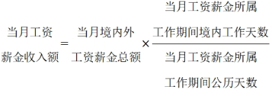 (4)無住所個人在境內(nèi)、境外單位同時擔(dān)任職務(wù)或者僅在境外單位任職,且當(dāng)期同時在境內(nèi)、境外工作的,按照工資薪金所屬境內(nèi)、境外工作天數(shù)占當(dāng)期公歷天數(shù)的比例計算確定來源于境內(nèi)、境外工資薪金所得的收入額。境外工作天數(shù)按照當(dāng)期公歷天數(shù)減去當(dāng)期境內(nèi)工作天數(shù)計算。