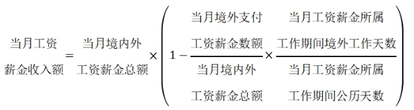 在一個納稅年度內(nèi),在境內(nèi)累計居住不超過90天的非居民個人,僅就歸屬于境內(nèi)工作期間并由境內(nèi)雇主支付或者負(fù)擔(dān)的工資薪金所得計算繳納個人所得稅。當(dāng)月工資薪金收入額的計算公式如下(公式一):
