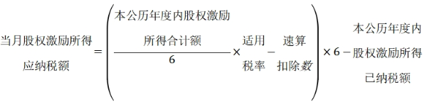 (3)非居民個人一個月內(nèi)取得股權(quán)激勵所得,單獨按照規(guī)定計算當(dāng)月收入額,不與當(dāng)月其他工資薪金合并,按6個月分?jǐn)傆嫸悾ㄒ粋€公歷年度內(nèi)的股權(quán)激勵所得應(yīng)合并計算),不減除費用,適用月度稅率表計算應(yīng)納稅額,計算公式如下(公式六):
