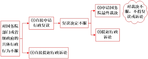 (1)對國務(wù)院部門或省級政府的具體行政行為不服的,向作出該具體行政行為的國務(wù)院部門或省級政府申請行政復(fù)議;對行政復(fù)議決定不服的,可以向人民法院提起訴訟,也可以向國務(wù)院申請最終裁決。