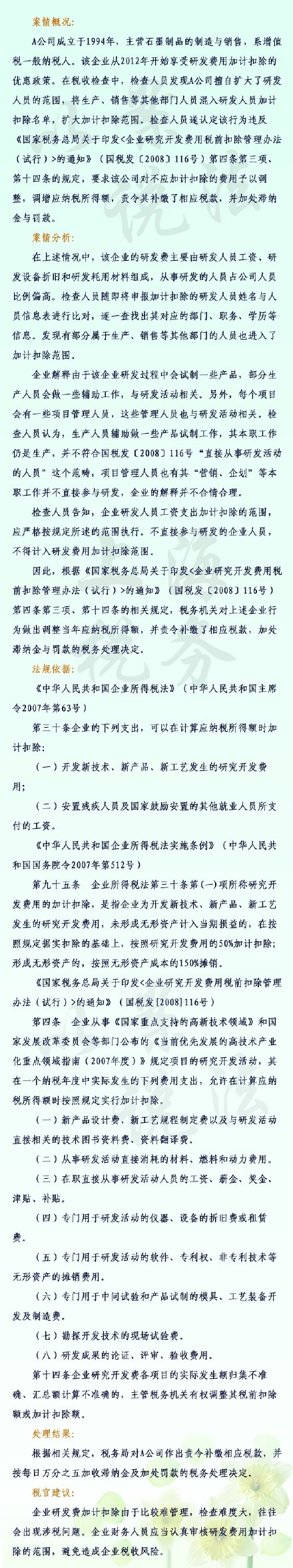 A公司存在制造研究開(kāi)發(fā)項(xiàng)目,檢查過(guò)程中發(fā)現(xiàn)該公司存在擴(kuò)大加計(jì)扣除范圍問(wèn)題,合計(jì)多申報(bào)研發(fā)費(fèi)用加計(jì)扣除近600萬(wàn)元。稅務(wù)機(jī)關(guān)遂對(duì)企業(yè)做出處理,責(zé)令其補(bǔ)繳了相應(yīng)稅款,并加處滯納金及罰款。稅官提醒:企業(yè)應(yīng)當(dāng)認(rèn)真審核研發(fā)費(fèi)用加計(jì)扣除的范圍,避免稅收風(fēng)險(xiǎn)。