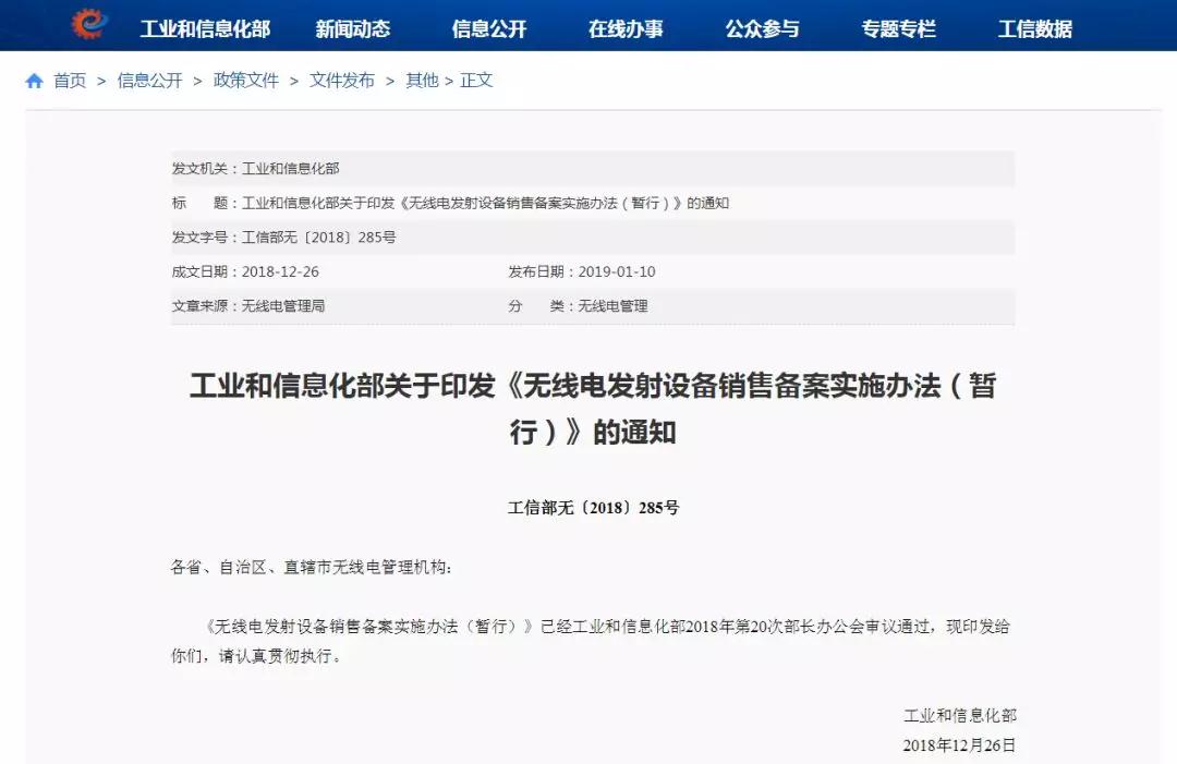 工信部發(fā)布《無線電發(fā)射設(shè)備銷售備案實施辦法(暫行)》,自3月1日起施行?!掇k法》共十五條,明確了實施銷售備案的依據(jù)和適用范圍、管理機構(gòu)、備案主體、備案內(nèi)容、操作流程等內(nèi)容,提出建立全國統(tǒng)一的無線電發(fā)射設(shè)備銷售備案信息平臺,并規(guī)定了監(jiān)督檢查要求。