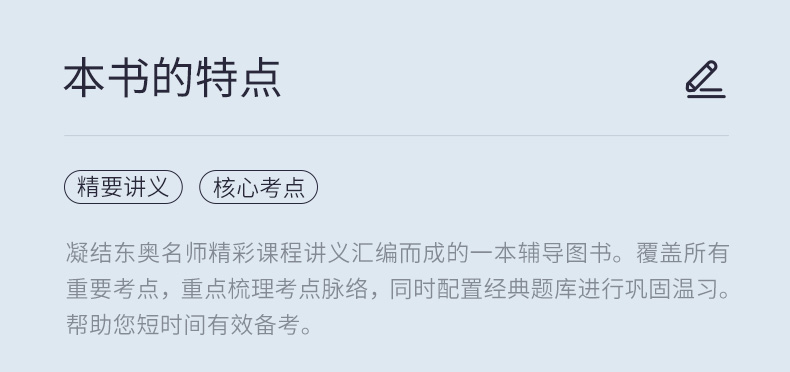 收到了,書的質(zhì)量很好,無論是內(nèi)容、紙張還是印刷。上網(wǎng)課配套書使用效果很好,看得出來東奧是有很用心在做培訓(xùn)教育。這個方向是正確的,希望能繼續(xù)堅持!