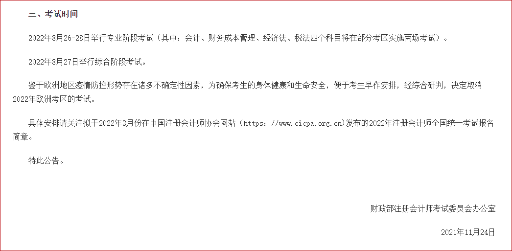 關(guān)于發(fā)布2022年注冊(cè)會(huì)計(jì)師全國(guó)統(tǒng)一考試報(bào)名時(shí)間和考試時(shí)間的 公告