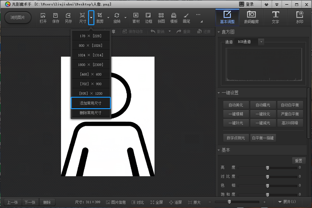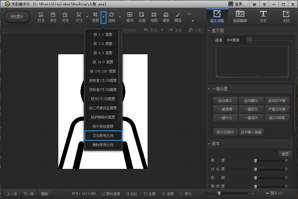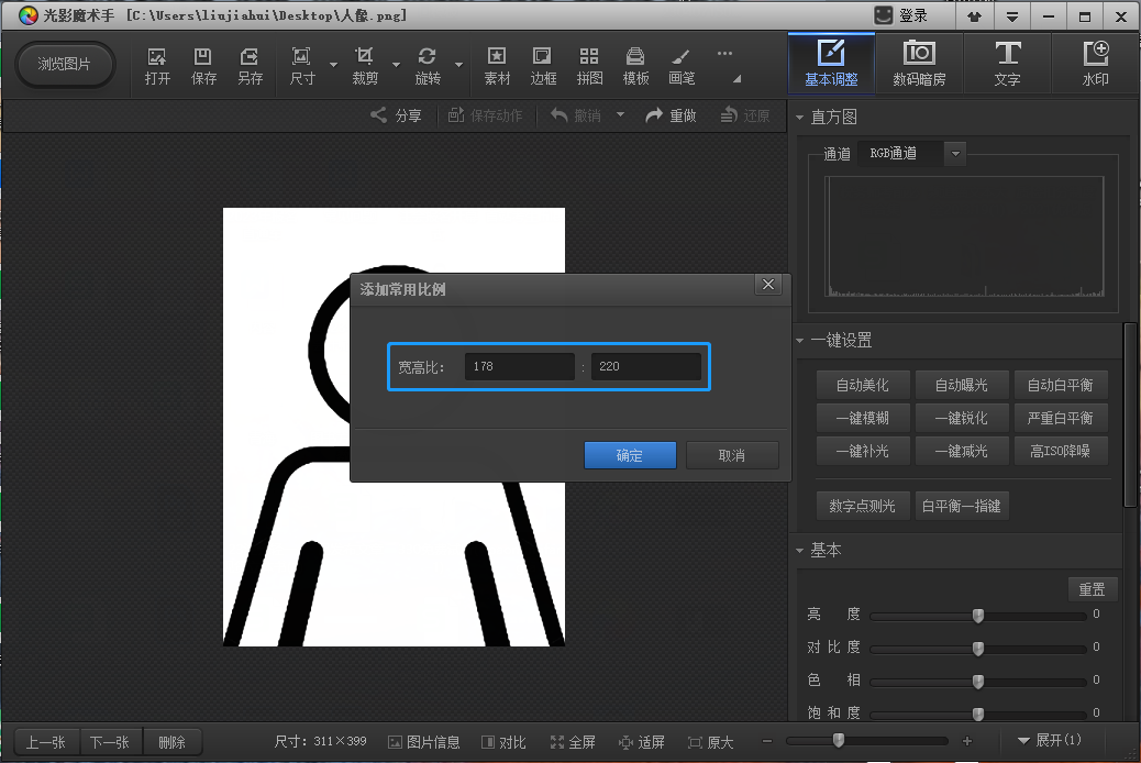 第三步:點擊“裁剪”旁下拉標志,點擊“添加常用比例”,輸入“178*220”,點擊確定后,再次展開裁剪旁選下拉標注,找到新添加比例并點擊,將圖片修改為178*220大小。點擊圖片,查看大圖。