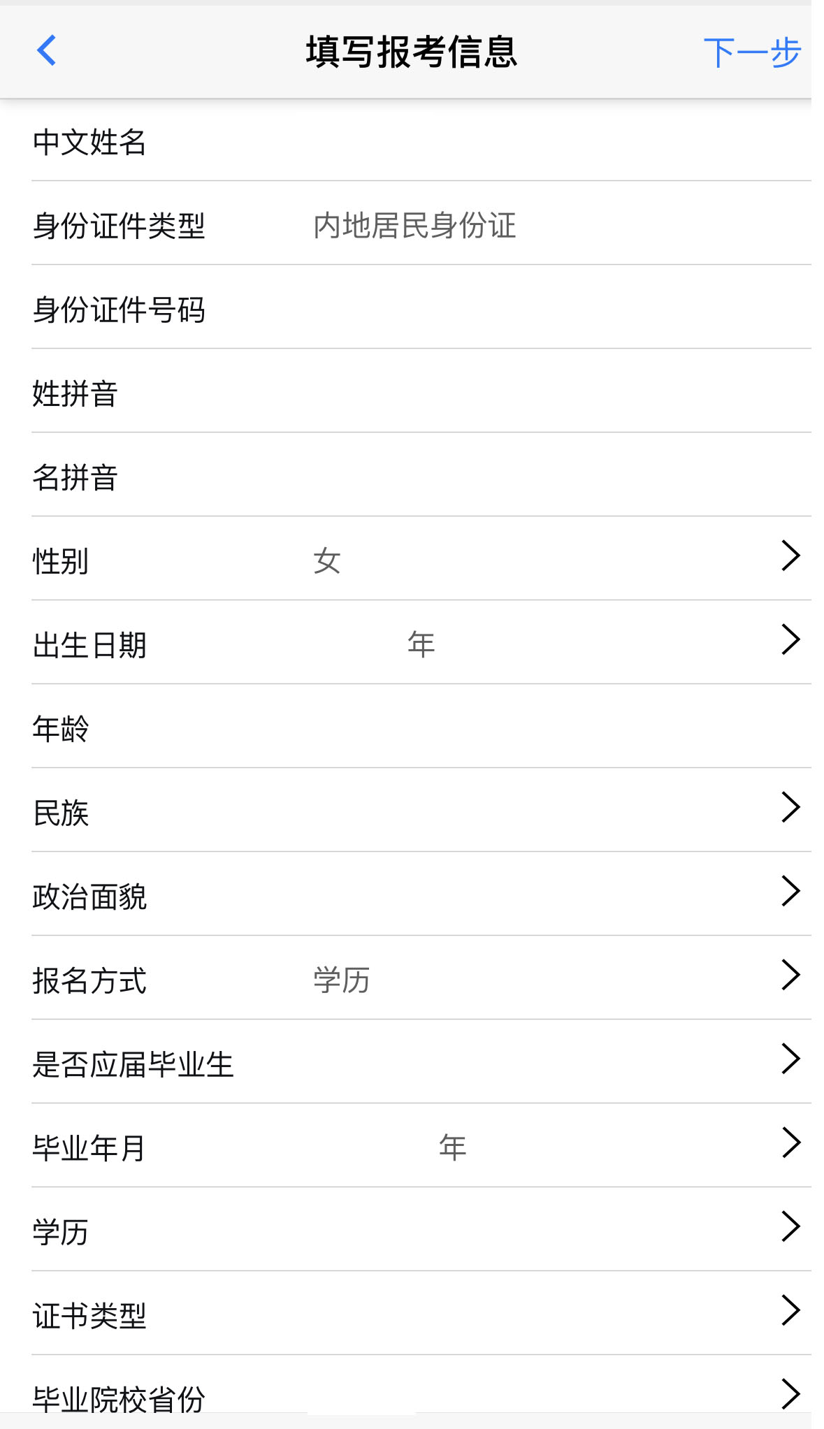 考生仔細核對報名信息的填報,如發(fā)現(xiàn)有填寫錯誤的地方可以點擊“上一步”進行修改,確保報名信息準確無誤。確定信息無誤后,考生點擊“下一步”完成并確認報名信息。