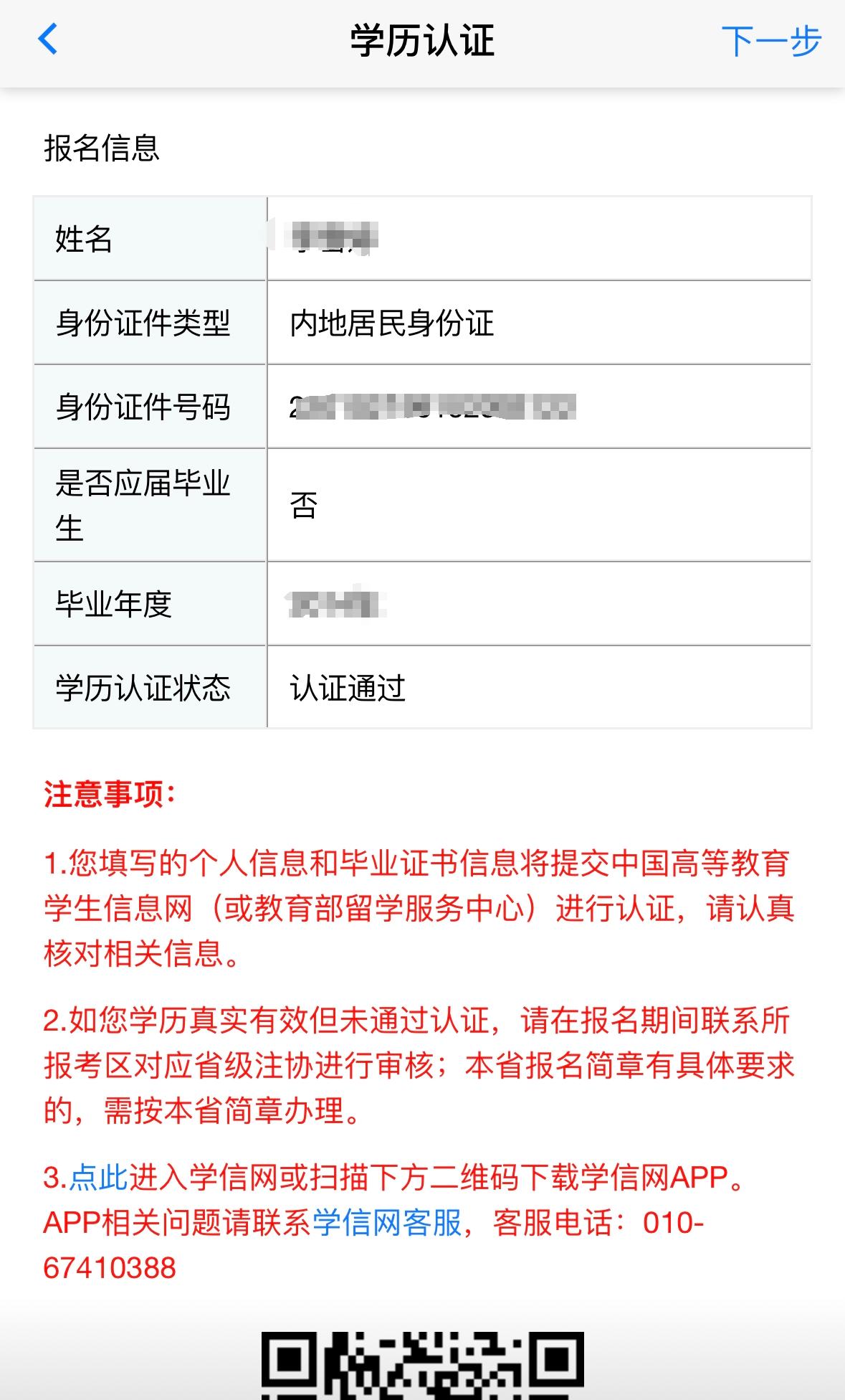 首次報名人員(不含應(yīng)屆畢業(yè)生)持國(境)內(nèi)學(xué)歷的,應(yīng)當通過學(xué)信網(wǎng)APP進行學(xué)歷信息認證授權(quán),授權(quán)后由網(wǎng)報系統(tǒng)根據(jù)身份證件信息鏈接“中國高等教育學(xué)生信息網(wǎng)”進行認證;