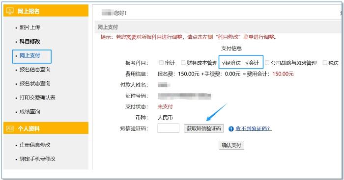 此部分考生需要核對要報考的科目,無疑義后,即可通過注冊時預留的手機獲取短信驗證碼,填寫并確認支付。