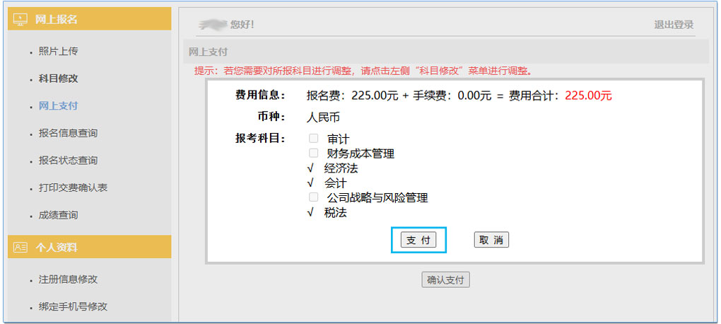 完成科目調(diào)整后,就可以直接點選左側【網(wǎng)上支付】項目,進入交費“正題”。
