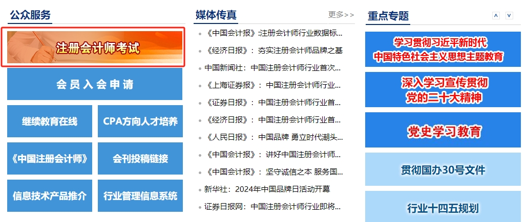 步驟1:進(jìn)入“中國(guó)注冊(cè)會(huì)計(jì)師協(xié)會(huì)”官方網(wǎng)站,點(diǎn)擊“注冊(cè)會(huì)計(jì)師考試”按鈕。