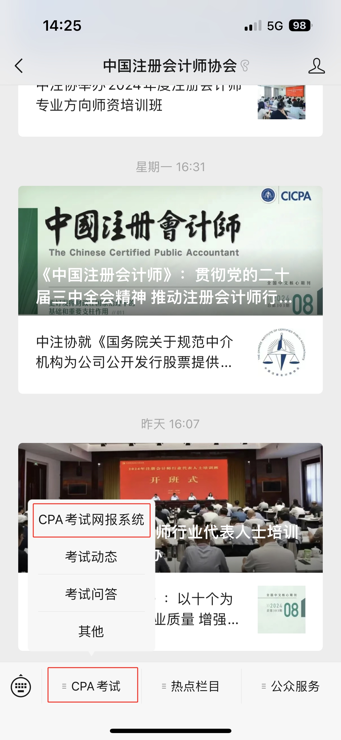 步驟1:微信搜索“中國(guó)注冊(cè)會(huì)計(jì)師協(xié)會(huì)”官方公眾號(hào),點(diǎn)擊底部菜單欄中“CPA考試”按鈕,選擇“CPA考試網(wǎng)報(bào)系統(tǒng)”選項(xiàng)。