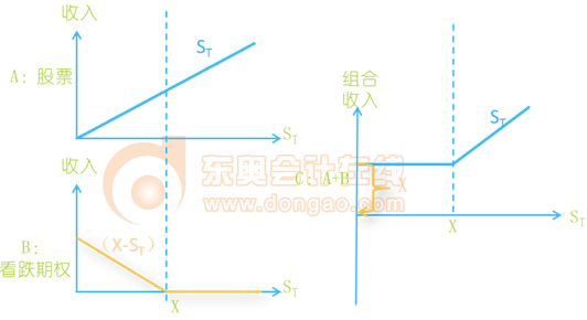股票加看跌期權(quán)組合,稱為保護性看跌期權(quán)。是指購買1份股票,同時購買該股票1份看跌期權(quán)。