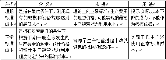 (一)標(biāo)準(zhǔn)成本按其制定所根據(jù)的生產(chǎn)技術(shù)和經(jīng)營管理水平,分為理想標(biāo)準(zhǔn)成本和正常標(biāo)準(zhǔn)成本。