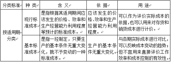 (二)標(biāo)準(zhǔn)成本按其適用期,分為現(xiàn)行標(biāo)準(zhǔn)成本和基本標(biāo)準(zhǔn)成本。